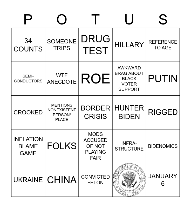 This bingo card has 1 images and 29 words: CHINA, TRUMP DEBUTS A NEW NICKNAME, MENTIONS NONEXISTENT PERSON/ PLACE, C'MON MAN, 34 COUNTS, DRUG TEST, WTF ANECDOTE, MODS ACCUSED OF NOT PLAYING FAIR, HUNTER BIDEN, CONVICTED FELON, RIGGED, BORDER CRISIS, JANUARY 6, PUTIN, TRUMP INSULTS A CITY, INFRA-STRUCTURE, INFLATION BLAME GAME, FOLKS, REFERENCE TO AGE, CROOKED, OBAMA, SOMEONE TRIPS, AWKWARD BRAG ABOUT BLACK VOTER SUPPORT, SEMI- CONDUCTORS, HILLARY, BIDENOMICS, UKRAINE, ROE and SOUL OF THE NATION.