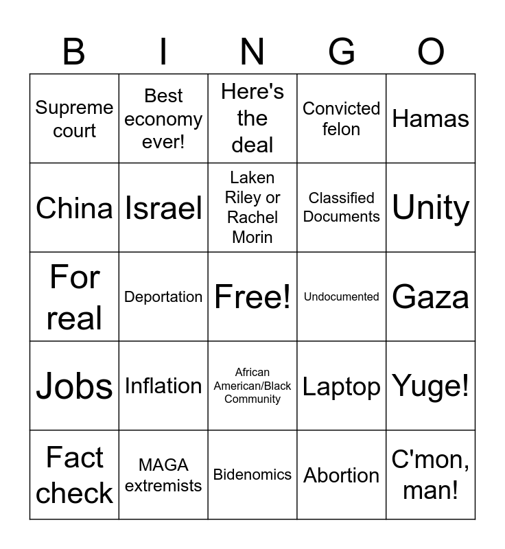 This bingo card has a free space and 49 words: Border, C'mon, man!, Folks, Bidenomics, Inflation, That's a lie!, Best economy ever!, Russia, China, Ukraine, Israel, Convicted felon, Yuge!, Laptop, Incoherent mumbling, Fentanyl, Laken Riley or Rachel Morin, Undocumented, Isis, Hamas, Deportation, Abortion, Supreme court, Classified Documents, Rule of law, Unity, Fact check, Fake news, African American/Black Community, Jobs, Infrastructure, Green energy, Drill, baby, drill!, Radical left, MAGA extremists, The Squad, New wars, It would never have happened., Gaza, Hezbollah, Existential threat., Climate change, Finish the wall, Unemployment, For real, Here's the deal, Covid / Pandemic, Democracy and Dictator.