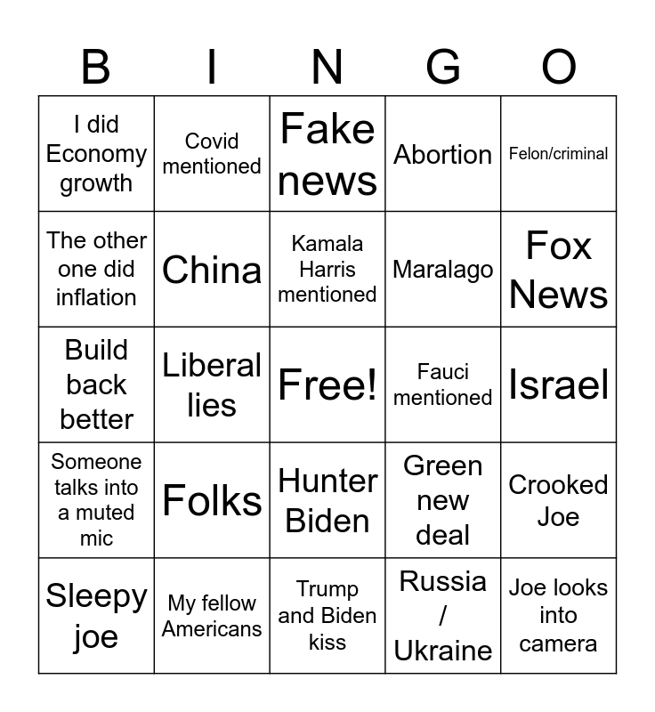 This bingo card has a free space and 24 words: Folks, My fellow Americans, Kamala Harris mentioned, Sleepy joe, Felon/criminal, I did Economy growth, The other one did inflation, Covid mentioned, Fauci mentioned, Hunter Biden, Maralago, Build back better, Green new deal, Crooked Joe, China, Russia / Ukraine, Israel, Fake news, Fox News, Liberal lies, Joe looks into camera, Someone talks into a muted mic, Abortion and Trump and Biden kiss.