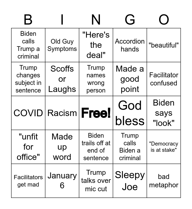 This bingo card has a free space and 24 words: Made up word, January 6, Trump names wrong person, Facilitators get mad, "beautiful", Biden calls Trump a criminal, Trump changes subject in sentence, Old Guy Symptoms, God bless, Biden trails off at end of sentence, Made a good point, COVID, Trump calls Biden a criminal, "Democracy is at stake", Scoffs or Laughs, Sleepy Joe, Biden says "look", "Here's the deal", Facilitator confused, Racism, bad metaphor, "unfit for office", Accordion hands and Trump talks over mic cut.