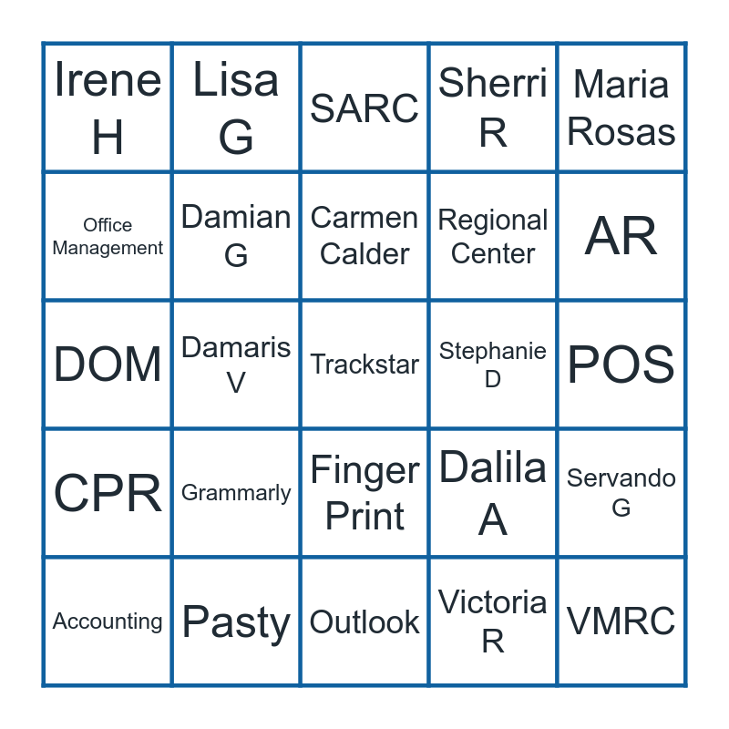 This bingo card has 48 words: Transportation, Trackstar, GoTo, Outlook, Grammarly, Nayeli M, Lisa G, Operations, Office Management, Excel, Damian G, Sherri R, Servando G, Dalila A, Breanna M, Katherine, Carmen Calder, Stephanie D, Cheer Squad, Maria Rosas, Damaris V, Victoria R, Irene H, Regional Center, Stockton, AR, Accounting, Homecare, Finger Print, CPR, Social Media, Core Values, Calendly, E Clocking, Pasty, Leticia, Jorge, POS, Service Coordinator, NBRC, RCEB, VMRC, SARC, ALTA, DOM, Staffing, Placement and On-Boarding.