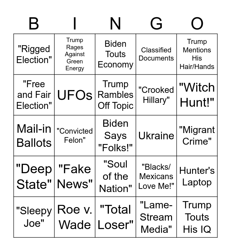 This bingo card has a free space and 38 words: January 6th, Deep Fakes, "YUGE", UFOs, Hunter's Laptop, "Fake News", Trump Rambles Off Topic, Epstein, Trump Mentions His Hair/Hands, "Crooked Hillary", "Convicted Felon", Classified Documents, Trump Touts His IQ, "Migrant Crime", "Free and Fair Election", "Deep State", Israel/ Palestine, Biden Touts Economy, Electric Vehicles, Ukraine, "Rigged Election", Roe v. Wade, "Witch Hunt!", "Sleepy Joe", Biden Says "Come on, Man!", "Total Loser", "Radical D.A.", "Make America Great Again", "You're Fired", Dictator Day 1, "Build the Wall", "Soul of the Nation", "Lame- Stream Media", Trump Rages Against Green Energy, Trump Keeps Talking After His Time Limit, "Blacks/ Mexicans Love Me!", Mail-in Ballots and Biden Stutters.