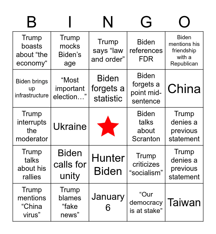 This bingo card has a free space and 24 words: Biden calls for unity, Trump blames “fake news”, Biden forgets a statistic, Trump mentions “China virus”, Biden mentions his friendship with a Republican, Trump boasts about “the economy“, Biden brings up infrastructure, Trump mocks Biden’s age, Biden talks about Scranton, Hunter Biden, Biden forgets a point mid-sentence, Trump interrupts the moderator, Trump criticizes “socialism”, Trump denies a previous statement, “Most important election…”, “Our democracy is at stake”, Trump denies a previous statement, Trump says “law and order”, China, Ukraine, Taiwan, Trump talks about his rallies, Biden references FDR and January 6.