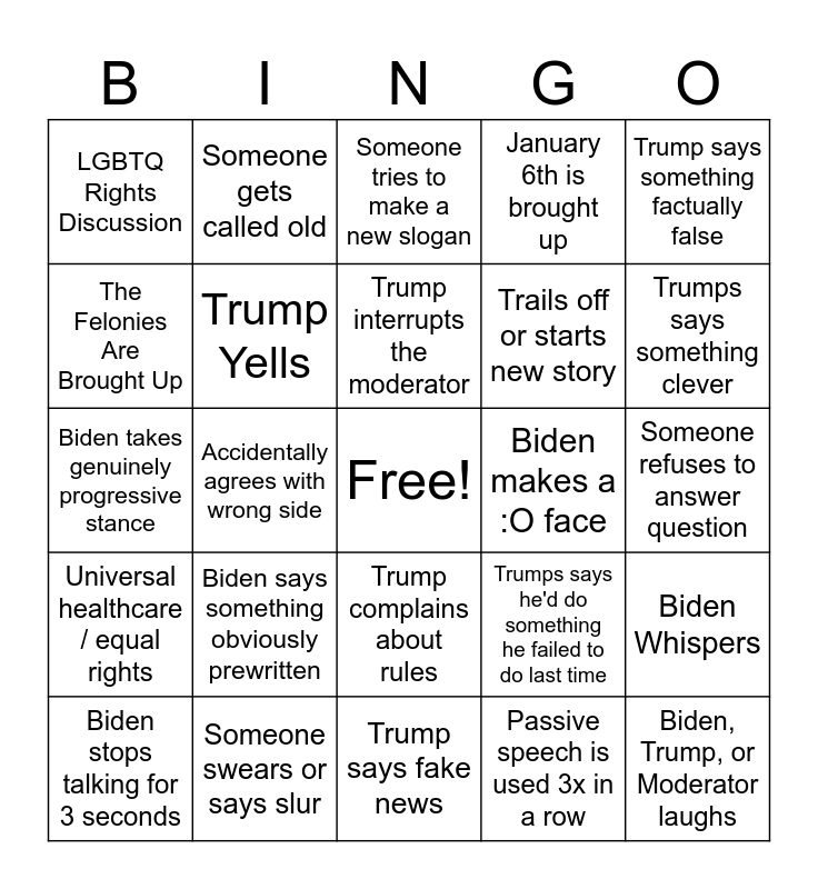 This bingo card has a free space and 25 words: Biden says something obviously prewritten, Trump says fake news, Trump interrupts the moderator, Biden stops talking for 3 seconds, Trump says something factually false, LGBTQ Rights Discussion, The Felonies Are Brought Up, Someone gets called old, Biden makes a :O face, Trump complains about rules, Trails off or starts new story, Biden takes genuinely progressive stance, Trumps says he'd do something he failed to do last time, Biden Whispers, Trump Yells, Moderator makes someone stfu, Someone refuses to answer question, Someone tries to make a new slogan, Trumps says something clever, Accidentally agrees with wrong side, Biden, Trump, or Moderator laughs, Someone swears or says slur, Universal healthcare / equal rights, January 6th is brought up and Passive speech is used 3x in a row.