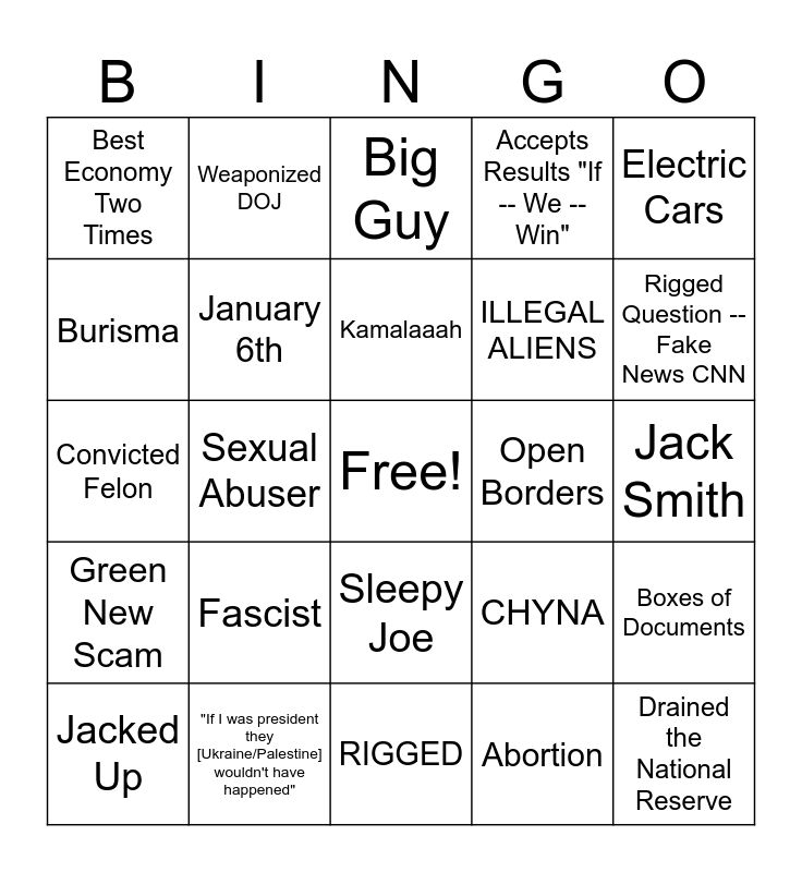 This bingo card has a free space and 27 words: CHYNA, Afghanistan Pullout, ILLEGAL ALIENS, RIGGED, Burisma, Big Guy, Weaponized DOJ, Green New Scam, Open Borders, Boxes of Documents, Convicted Felon, Accepts Results "If -- We -- Win", Jacked Up, "If I was president they [Ukraine/Palestine] wouldn't have happened", Rigged Question -- Fake News CNN, Perfect Phone Call, January 6th, Kamalaaah, Fascist, Best Economy Two Times, Jack Smith, Abortion, Sexual Abuser, Drained the National Reserve, Sleepy Joe, Electric Cars and Stormy.