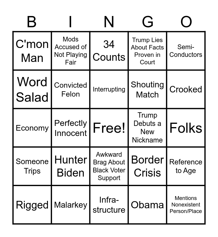This bingo card has a free space and 31 words: Infra-structure, WTF Anecdote, Perfectly Innocent, Putin, C'mon Man, 34 Counts, Convicted Felon, Border Crisis, Trump Debuts a New Nickname, Obama, Folks, Mentions Nonexistent Person/Place, China, Trump Insults a City, Crooked, Jan. 6th, Reference to Age, Hunter Biden, Someone Trips, Awkward Brag About Black Voter Support, Semi- Conductors, Drug Test, Rigged, Mods Accused of Not Playing Fair, Shouting Match, Word Salad, Trump Lies About Facts Proven in Court, Economy, Malarkey, Interrupting and Stormy Daniels.