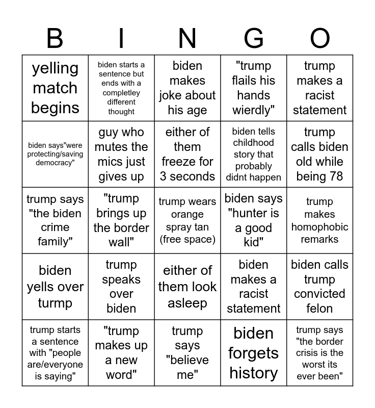 This bingo card has a free space and 28 words: biden calls trump convicted felon, biden says "listen folks", biden tells childhood story that probably didnt happen, biden forgets history, biden says"were protecting/saving democracy", biden makes joke about his age, biden starts a sentence but ends with a completley different thought, biden yells over turmp, biden says "hunter is a good kid", trump starts a sentence with "people are/everyone is saying", trump says "the biden crime family", "trump flails his hands wierdly", "trump makes up a new word", trump says "believe me", trump calls biden old while being 78, trump insults jake tapper, trump speaks over biden, guy who mutes the mics just gives up, either of them freeze for 3 seconds, either of them look asleep, yelling match begins, china is mentioned, trump says "the border crisis is the worst its ever been", "trump brings up the border wall", trump makes homophobic remarks, biden makes a racist statement, trump makes a racist statement and trump says illegals are taking american jobs.
