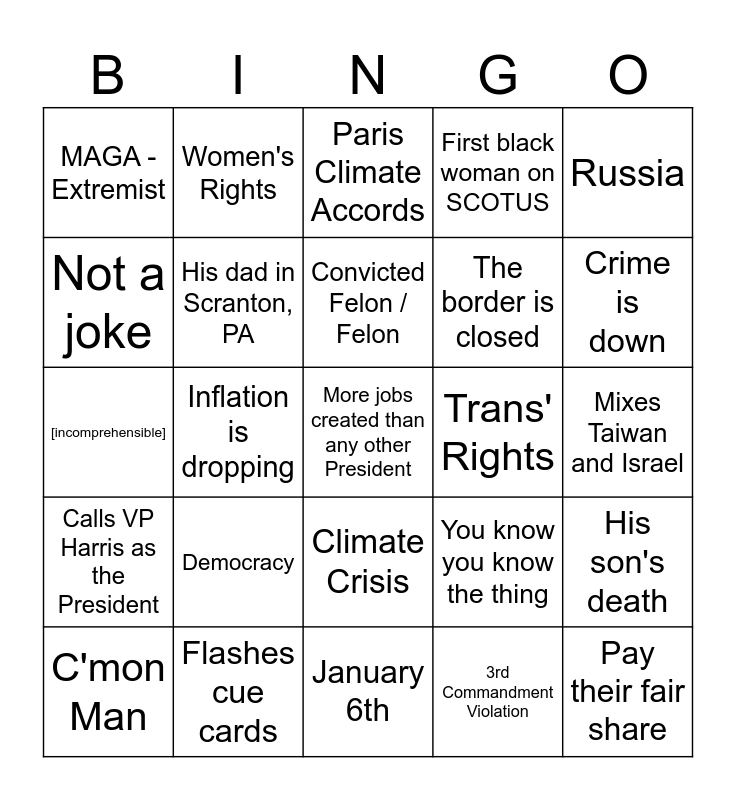 This bingo card has 25 words: Democracy, January 6th, Convicted Felon / Felon, C'mon Man, Russia, MAGA - Extremist, Not a joke, Women's Rights, Trans' Rights, Climate Crisis, The border is closed, [incomprehensible], You know you know the thing, His son's death, His dad in Scranton, PA, Pay their fair share, Mixes Taiwan and Israel, Paris Climate Accords, Crime is down, Inflation is dropping, More jobs created than any other President, Flashes cue cards, Calls VP Harris as the President, First black woman on SCOTUS and 3rd Commandment Violation.