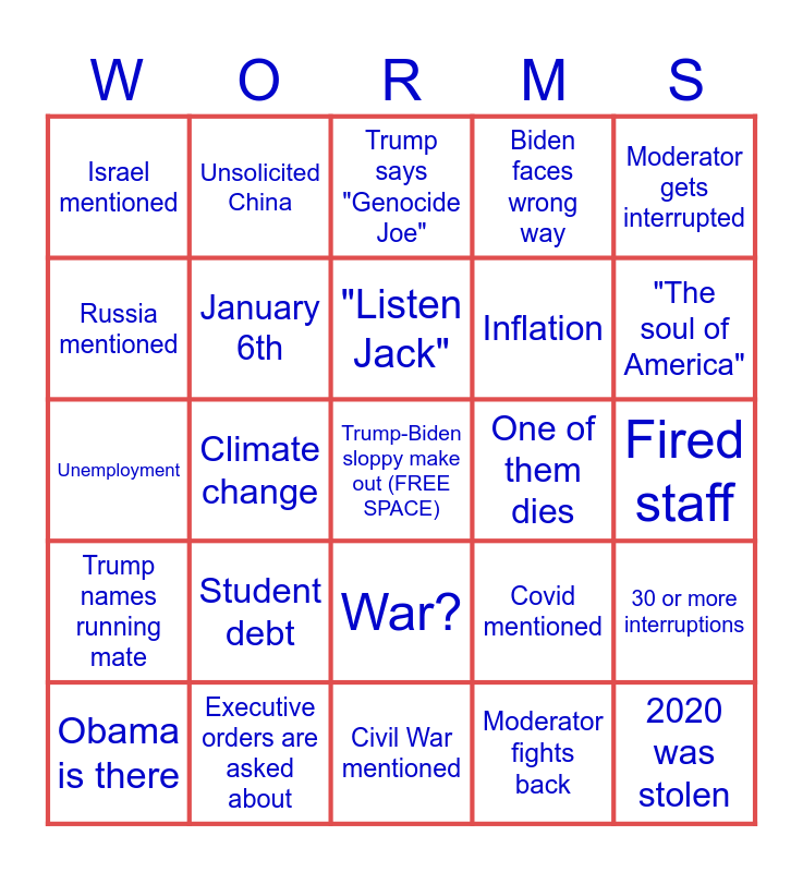 This bingo card has a free space and 38 words: Protestors get inside, 34 counts, Hunter Biden, January 6th, 30 or more interruptions, Student debt, "Listen Jack", "Sleepy Joe", Moderator gets interrupted, Inflation, Climate change, Biden faces wrong way, 2020 was stolen, Fired staff, Russia mentioned, Trump names running mate, RFK mentioned, Trump says "Genocide Joe", Cannabis, One of them dies, Israel mentioned, Executive orders are asked about, "The soul of America", Obama is there, Pardons, Civil War mentioned, 5 runs over time for question, Mental ability, Cursing 10 times, "Will you shut up man", "LETS GO BRANDON", War?, Moderator fights back, Unsolicited China, Outdated racial slur, Covid mentioned, Unemployment and PAC funding.