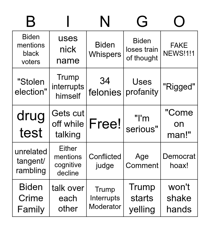 This bingo card has a free space and 24 words: Either mentions cognitive decline, talk over each other, 34 felonies, Biden Crime Family, FAKE NEWS!1!1, Biden mentions black voters, "Stolen election", uses nick name, "I'm serious", Conflicted judge, Uses profanity, drug test, Age Comment, Democrat hoax!, Trump interrupts himself, Trump starts yelling, "Come on man!", Biden Whispers, "Rigged", Gets cut off while talking, won't shake hands, unrelated tangent/ rambling, Biden loses train of thought and Trump Interrupts Moderator.