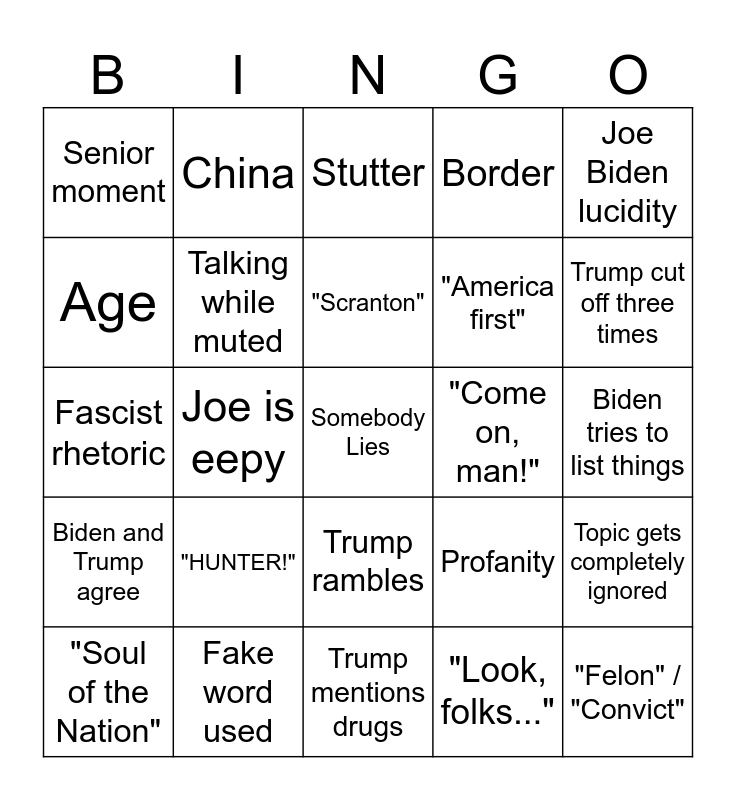 This bingo card has a free space and 31 words: Trump mentions drugs, Trump complains about rules, Joe is eepy, Fighting moderators, Senior moment, Stutter, Talking while muted, Profanity, "Come on, man!", "Look, folks...", Biden tries to list things, "Felon" / "Convict", "Marxists" / "Antifa", Democrat gets name dropped, Trump cut off three times, "Worst President" argument, Topic gets completely ignored, "HUNTER!", Biden and Trump agree, Trump rambles, Joe Biden lucidity, "Wall", "Soul of the Nation", China, "America first", Age, Border, Fascist rhetoric, Fake word used, "Scranton" and Dark Brandon.