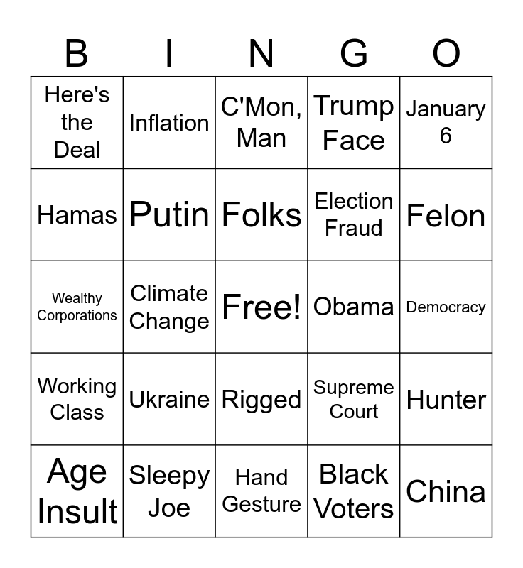 This bingo card has a free space and 24 words: Ukraine, Sleepy Joe, Folks, Age Insult, January 6, Here's the Deal, Hamas, Inflation, Obama, Rigged, Election Fraud, Wealthy Corporations, Supreme Court, Hunter, Putin, Black Voters, Democracy, C'Mon, Man, Felon, Climate Change, China, Working Class, Trump Face and Hand Gesture.