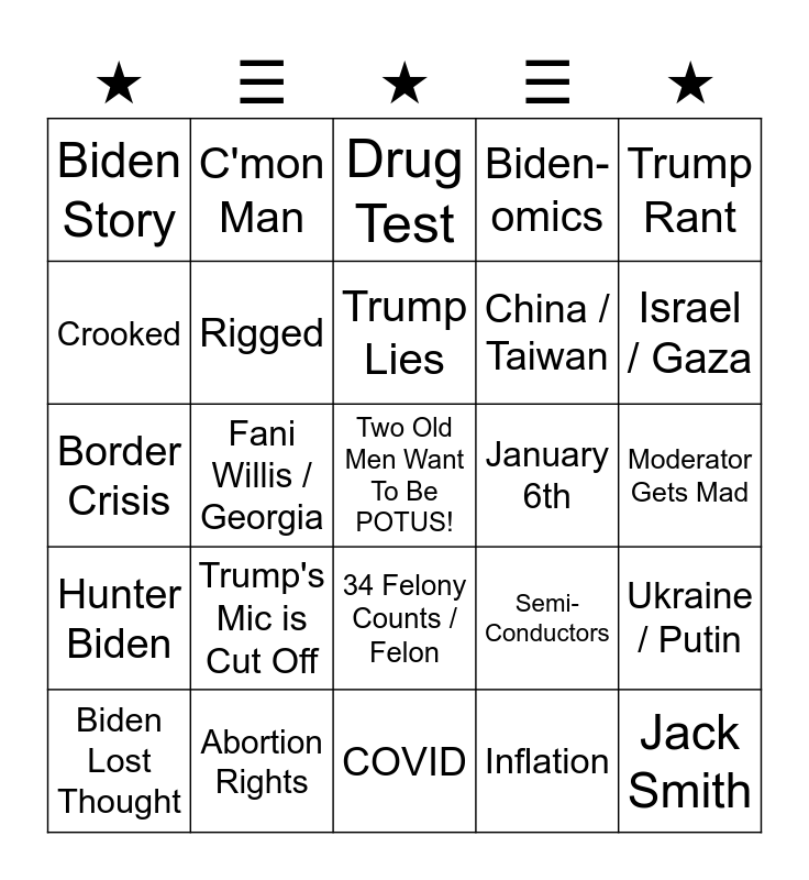 This bingo card has a free space and 24 words: Trump's Mic is Cut Off, Abortion Rights, Trump Lies, Biden Lost Thought, Trump Rant, Biden Story, Crooked, C'mon Man, January 6th, 34 Felony Counts / Felon, China / Taiwan, Border Crisis, Semi-Conductors, Ukraine / Putin, Rigged, Inflation, Moderator Gets Mad, Drug Test, Israel / Gaza, Fani Willis / Georgia, Jack Smith, Hunter Biden, Biden-omics and COVID.