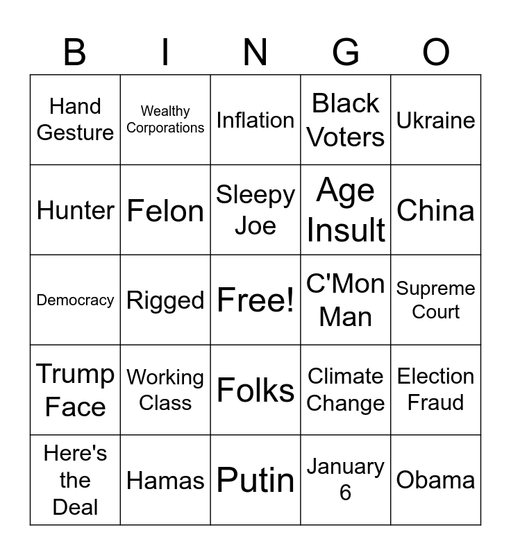 This bingo card has a free space and 24 words: Working Class, Hamas, Sleepy Joe, Here's the Deal, Ukraine, Hand Gesture, Hunter, Wealthy Corporations, C'Mon Man, Folks, Age Insult, Democracy, Climate Change, Election Fraud, Felon, January 6, Supreme Court, Inflation, China, Rigged, Obama, Trump Face, Black Voters and Putin.