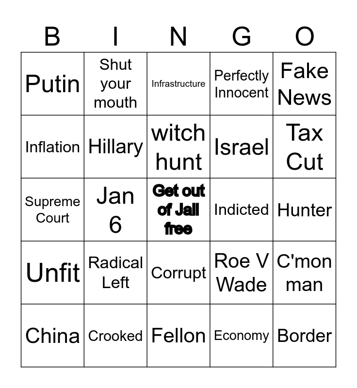 This bingo card has a free space and 29 words: China, Rigged, Jan 6, Folks, Putin, Infrastructure, Hillary, Radical Left, Indicted, Crooked, Hunter, Border, Fellon, Economy, Tax Cut, Woke, Corrupt, Unfit, Fake News, Supreme Court, Roe V Wade, Ukraine, Israel, Inflation, Perfectly Innocent, Shut your mouth, C'mon man, witch hunt and Democracy.