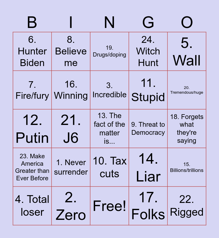 This bingo card has a free space and 24 words: 1. Never surrender, 2. Zero, 3. Incredible, 4. Total loser, 5. Wall, 6. Hunter Biden, 7. Fire/fury, 8. Believe me, 9. Threat to Democracy, 10. Tax cuts, 11. Stupid, 12. Putin, 14. Liar, 15. Billions/trillions, 16. Winning, 17. Folks, 18. Forgets what they're saying, 19. Drugs/doping, 20. Tremendous/huge, 21. J6, 22. Rigged, 23. Make America Greater than Ever Before, 24. Witch Hunt and Free!.