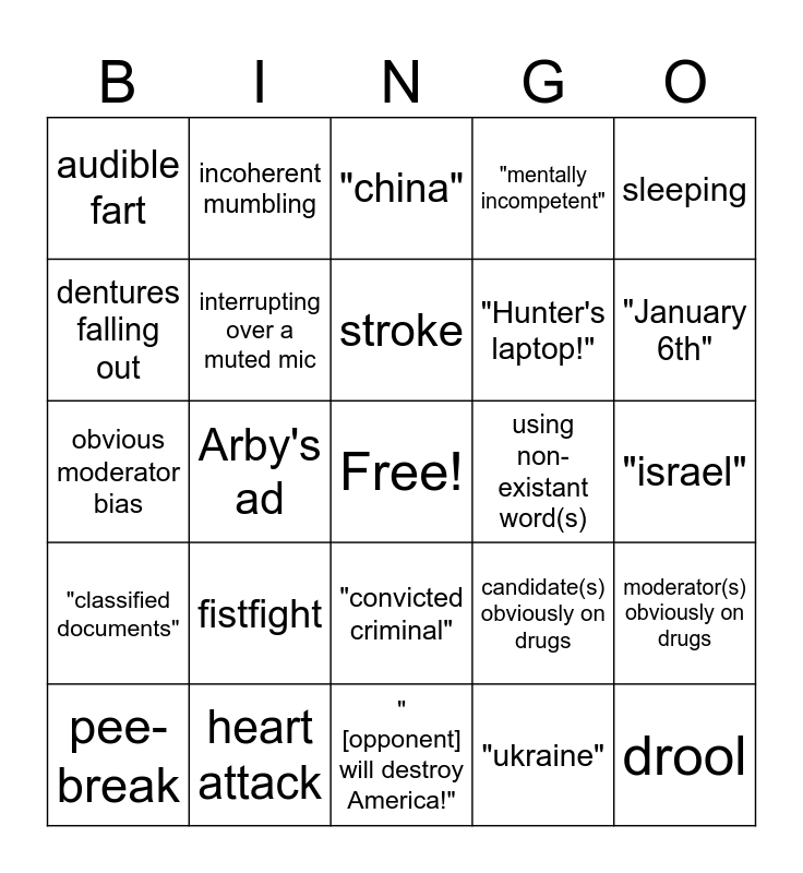 This bingo card has a free space and 24 words: fistfight, heart attack, stroke, pee-break, sleeping, audible fart, dentures falling out, incoherent mumbling, using non-existant word(s), "convicted criminal", "Hunter's laptop!", obvious moderator bias, candidate(s) obviously on drugs, moderator(s) obviously on drugs, interrupting over a muted mic, "ukraine", "israel", "china", "January 6th", Arby's ad, drool, "classified documents", "mentally incompetent" and "[opponent] will destroy America!".
