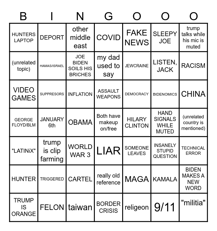 This bingo card has a free space and 48 words: MAGA, LISTEN, JACK, BORDER CRISIS, JANUARY 6th, INFLATION, (unrelated country is mentioned), DEPORT, FELON, SLEEPY JOE, LIAR, trump talks while his mic is muted, COVID, BIDENOMICS, DEMOCRACY, HUNTER, HAND SIGNALS WHILE MUTED, (unrelated topic), RACISM, KAMALA, FAKE NEWS, JEWCRAINE, OBAMA, HUNTERS LAPTOP, HAMAS/ISRAEL, BIDEN MAKES A NEW WORD, JOE BIDEN SOILS HIS BRICHES, CHINA, TRUMP IS ORANGE, ASSAULT WEAPONS, SUPPRESORS, 9/11, HILARY CLINTON, TECHNICAL ERROR, TRIGGERED, GEORGE FLOYD/BLM, SOMEONE LEAVES, INSANELY STUPID QUESTION, VIDEO GAMES, WORLD WAR 3, CARTEL, "LATINiX", "militia", other middle east, taiwan, my dad used to say, really old reference, trump is clip farming and religeon.