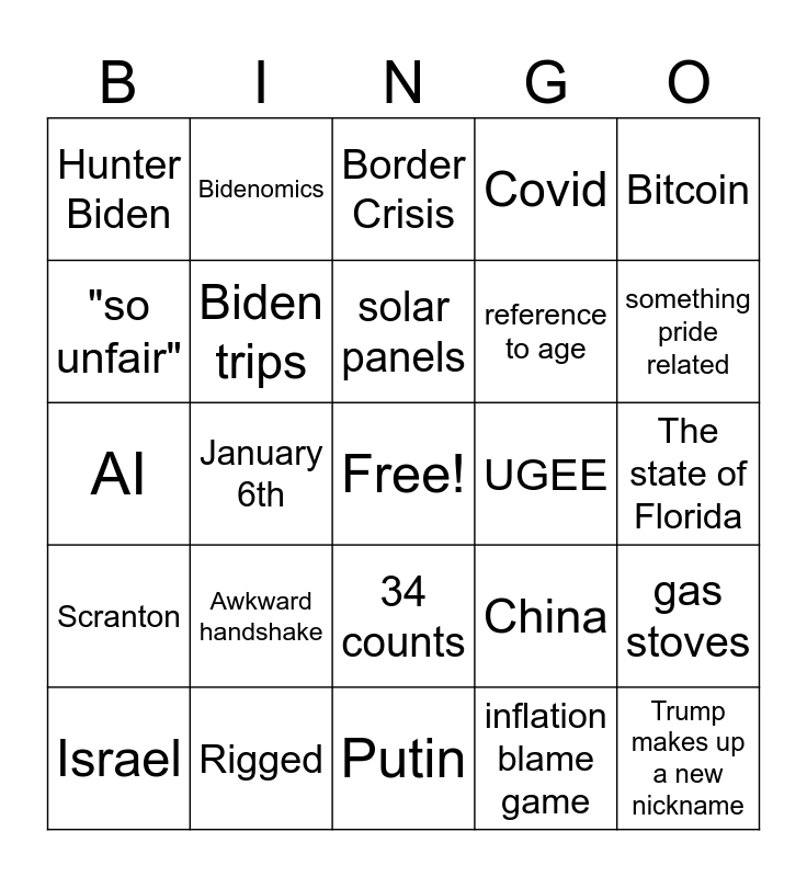 This bingo card has a free space and 29 words: Israel, Obama, January 6th, Felon, Hunter Biden, Border Crisis, Biden trips, Awkward handshake, UGEE, Rigged, The state of Florida, Trump makes up a new nickname, Putin, inflation blame game, something pride related, Biden sits down, 34 counts, Scranton, Bitcoin, AI, China, The wall, reference to age, "so unfair", Covid, Bidenomics, gas stoves, solar panels and Fake news.