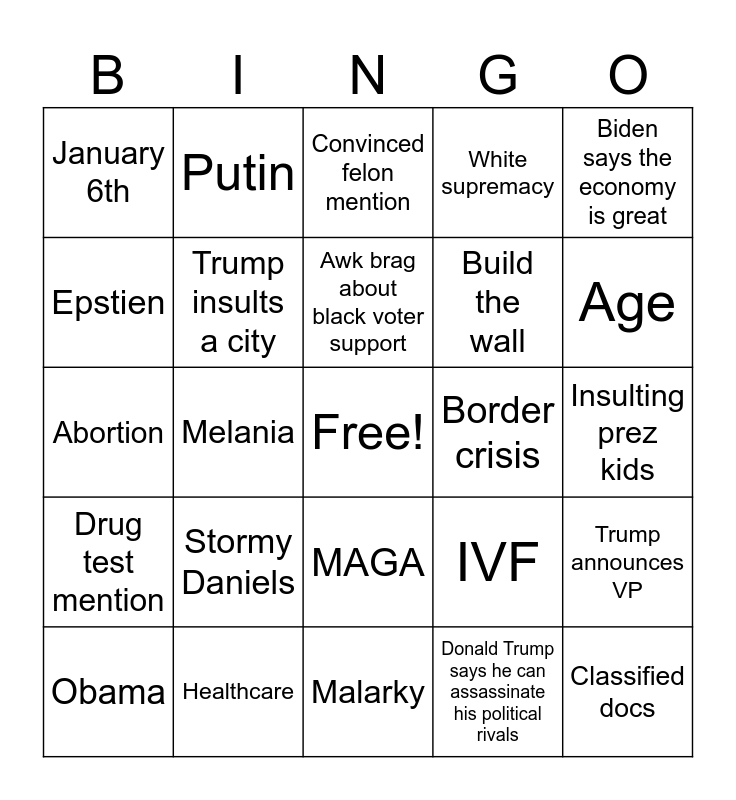 This bingo card has a free space and 34 words: Biden freezes and can’t remember what he was saying, Donald Trump says he can assassinate his political rivals, Biden stumbles over his words, Trump walks awkwardly around the stage, Drug test mention, Trump insults a city, Biden says the economy is great, Obama, Putin, China, Awk brag about black voter support, Convinced felon mention, Student loans, Housing market, Border crisis, Age, Healthcare, Abortion, Stormy Daniels, IVF, MAGA, Eye roll, January 6th, Insulting prez kids, Malarky, Classified docs, White supremacy, Christian nationalism, Build the wall, Epstien, Kamala Harris, Melania, Trump announces VP and One walks off stage.