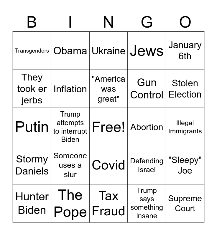 This bingo card has a free space and 29 words: Hunter Biden, Trump Indictment, Trump attempts to interrupt Biden, Biden forgets what he's talking about, Transgenders, Ukraine, Inflation, Someone uses a slur, Abortion, The Pope, Illegal Immigrants, Supreme Court, Tax Fraud, Trump says something insane, Stolen Election, Jeffery Epstein, Covid, Stormy Daniels, January 6th, Putin, Defending Israel, Kamala Harris, Gun Control, They took er jerbs, Jews, Obama, "Sleepy" Joe, "America was great" and "Make America Great Again".