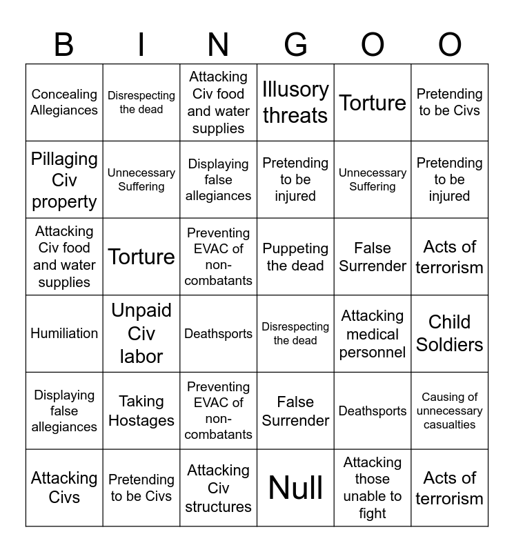 ⚠ This card has duplicate items: Political Assassinations (2), Deathsports (2), Mistreating POWs (2), Unpaid Civ labor (2), Taking Hostages (2), Humiliation (2), Disrespecting the dead (2), Use of Bioweapons (2), Unnecessary Suffering (2), Child Soldiers (2), Acts of terrorism (2), Pillaging Civ property (2), Preventing EVAC of non-combatants (2), Torture (2), Pretending to be medical personnel (2), Pretending to be Civs (2), Pretending to be injured (2), Concealing Allegiances (2), Pretending to surrender (2), Displaying false allegiances (2), False Surrender (2), Puppeting the dead (2), Illusory threats (2), Attacking Civs (2), Attacking medical personnel (2), Attacking those unable to fight (2), Attacking Civ structures (2), Desecrating places of worship (2), Attacking Civ food and water supplies (2), Null (6)