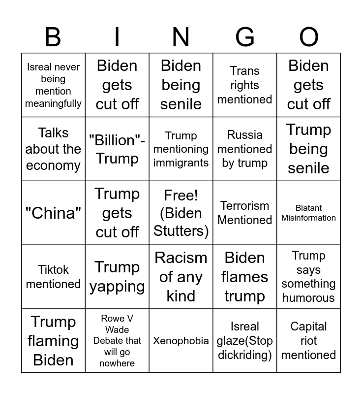 This bingo card has a free space and 24 words: Trump yapping, Rowe V Wade Debate that will go nowhere, Trump mentioning immigrants, Trump flaming Biden, Biden gets cut off, Isreal never being mention meaningfully, Talks about the economy, Biden gets cut off, Terrorism Mentioned, Racism of any kind, Russia mentioned by trump, "China", Biden flames trump, Trump says something humorous, "Billion"-Trump, Isreal glaze(Stop dickriding), Blatant Misinformation, Biden being senile, Trump being senile, Trump gets cut off, Capital riot mentioned, Tiktok mentioned, Trans rights mentioned and Xenophobia.