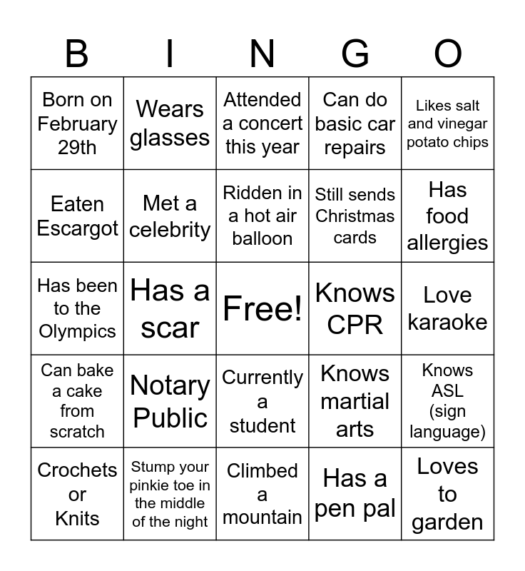 This bingo card has a free space and 24 words: Notary Public, Stump your pinkie toe in the middle of the night, Ridden in a hot air balloon, Crochets or Knits, Likes salt and vinegar potato chips, Born on February 29th, Eaten Escargot, Wears glasses, Knows CPR, Currently a student, Still sends Christmas cards, Has been to the Olympics, Knows martial arts, Knows ASL (sign language), Met a celebrity, Has a pen pal, Love karaoke, Attended a concert this year, Has food allergies, Has a scar, Loves to garden, Can bake a cake from scratch, Can do basic car repairs and Climbed a mountain.