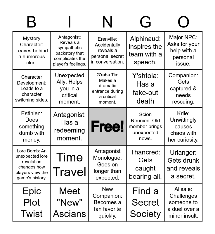 This bingo card has a free space and 24 words: Time Travel, Meet "New" Ascians, G'raha Tia: Makes a dramatic entrance during a critical moment., Epic Plot Twist, Major NPC: Asks for your help with a personal issue., Mystery Character: Leaves behind a humorous clue., Character Development: Leads to a character switching sides., Antagonist: Reveals a sympathetic backstory that complicates the player's feelings., Scion Reunion: Old member brings unexpected news., Antagonist Monologue: Goes on longer than expected., Y'shtola: Has a fake-out death, Estinien: Does something dumb with money., Thancred: Gets caught bearing all., Urianger: Gets drunk and reveals a secret., Unexpected Ally: Helps you in a critical moment., Find a Secret Society, Krile: Unwittingly causes chaos with her curiosity., Erenville: Accidentally reveals a personal secret in conversation., Companion: Gets captured & needs rescuing., Antagonist: Has a redeeming moment., Alisaie: Challenges someone to a duel over a minor insult., Lore Bomb: An unexpected lore revelation changes how players view the game's history., Alphinaud: inspires the team with a speech. and New Companion: Becomes a fan favorite quickly..