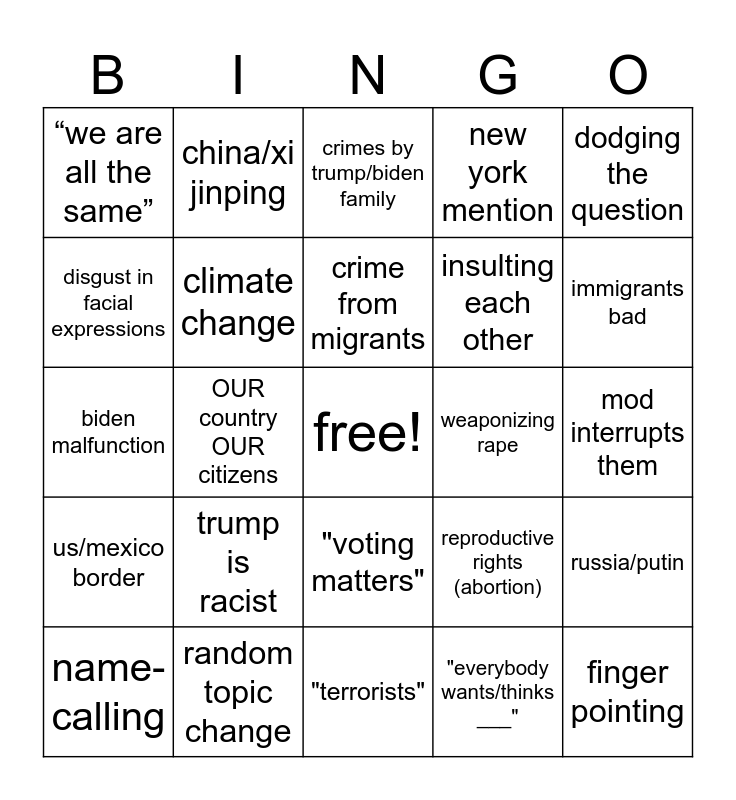 This bingo card has a free space and 24 words: trump is racist, random topic change, crime from migrants, name-calling, dodging the question, “we are all the same”, disgust in facial expressions, china/xi jinping, weaponizing rape, "voting matters", insulting each other, biden malfunction, reproductive rights (abortion), russia/putin, climate change, "everybody wants/thinks ___", mod interrupts them, crimes by trump/biden family, immigrants bad, OUR country OUR citizens, finger pointing, us/mexico border, new york mention and "terrorists".