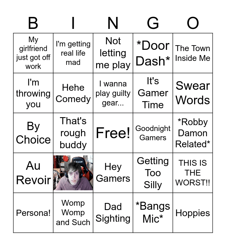 This bingo card has 1 images, a free space and 23 words: Womp Womp and Such, I wanna play guilty gear..., Persona!, The Town Inside Me, My girlfriend just got off work, I'm throwing you, I'm getting real life mad, Goodnight Gamers, Hey Gamers, It's Gamer Time, By Choice, Getting Too Silly, THIS IS THE WORST!!, Hehe Comedy, *Bangs Mic*, *Robby Damon Related*, Not letting me play, Swear Words, That's rough buddy, Hoppies, Au Revoir, *Door Dash* and Dad Sighting.