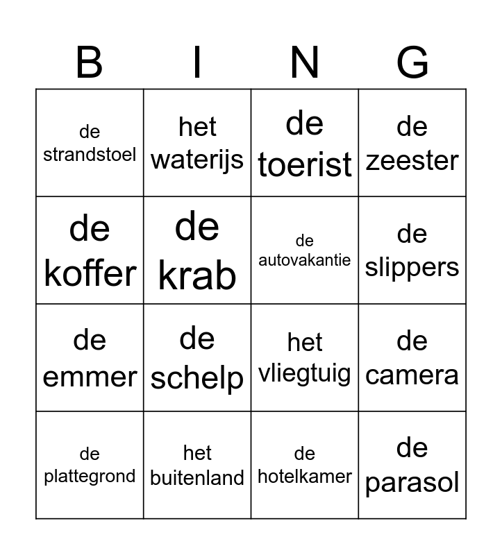 This bingo card has 31 words: Free!, de bergen, de camera, de strandbal, de strandstoel, de toerist, de autovakantie, de bagage, het buitenland, de zwembroek, de hotelkamer, de plattegrond, het vliegticket, het paspoort, de schelp, de sauna, de zonnebrandcrème, het kompas, de parasol, de vlieger, de koffer, de tent, de caravan, het waterijs, de emmer, de krab, de zeester, het vliegtuig, het kampvuur, de slippers and de rugzak.