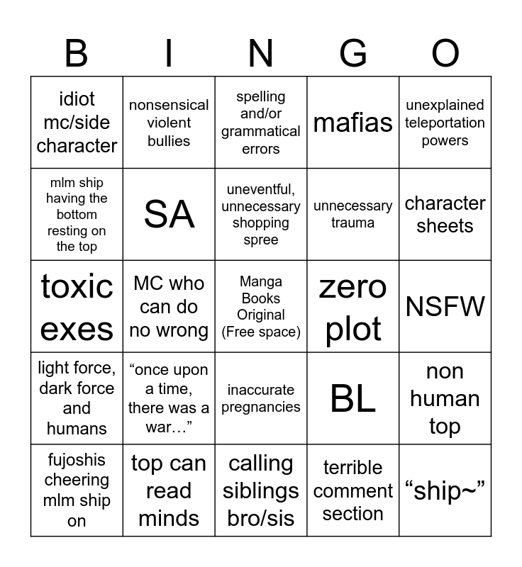 This bingo card has a free space and 24 words: “once upon a time, there was a war…”, top can read minds, uneventful, unnecessary shopping spree, fujoshis cheering mlm ship on, unexplained teleportation powers, idiot mc/side character, mlm ship having the bottom resting on the top, nonsensical violent bullies, zero plot, inaccurate pregnancies, unnecessary trauma, toxic exes, BL, non human top, SA, terrible comment section, NSFW, spelling and/or grammatical errors, character sheets, MC who can do no wrong, “ship~”, light force, dark force and humans, mafias and calling siblings bro/sis.