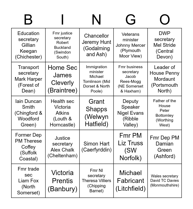 This bingo card has 25 words: Justice secretary Alex Chalk (Cheltenham), Fmr NI secretary Theresa Villiers (Chipping Barnet), Immigration minister Michael Tomlinson (Mid Dorset & North Poole), Fmr trade sec Liam Fox (North Somerset), DWP secretary Mel Stride (Central Devon), Education secretary Gillian Keegan (Chichester), Transport secretary Mark Harper (Forest of Dean), Fmr justice secretary Robert Buckland (Swindon South), Deputy Speaker Nigel Evans (Ribble Valley), Simon Hart (Caerfyrddin), Fmr business secretary Jacob Rees-Mogg (NE Somerset & Haxham), Iain Duncan Smith (Chingford & Woodford Green), Fmr PM Liz Truss (SW Norfolk), Fmr Dep PM Damian Green (Ashford), Home Sec James Cleverly (Braintree), Wales secretary David TC Davies (Monmouthshire), Father of the House Peter Bottomley (Worthing West), Chancellor Jeremy Hunt (Godalming and Ash), Leader of House Penny Mordaunt (Portsmouth North), Health sec Victoria Atkins (Louth & Horncastle), Grant Shapps (Welwyn Hatfield), Victoria Prentis (Banbury), Former Dep PM Therese Coffey (Suffolk Coastal), Veterans minister Johnny Mercer (Plymouth Moor View) and Michael Fabricant (Litchfield).