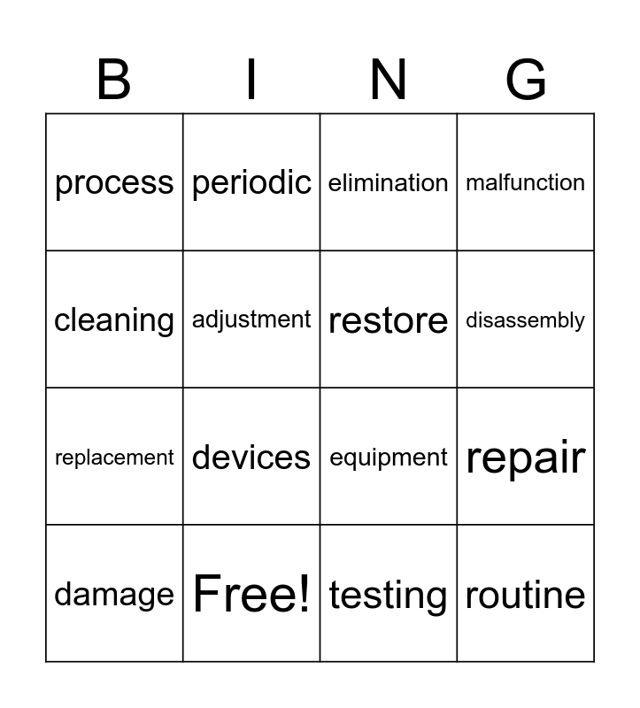 This bingo card has 16 words: Free!, repair, elimination, process, replacement, periodic, equipment, testing, cleaning, adjustment, damage, malfunction, devices, disassembly, restore and routine.