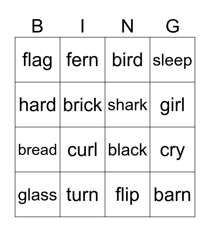 This bingo card has 34 words: Free!, car, star, farm, barn, shark, hard, her, fern, burn, girl, bird, corn, torn, turn, curl, thorn, black, blue, blend, blender, clap, flag, flip, play, glass, sleep, slide, bread, brick, crab, cry, drive and drum.