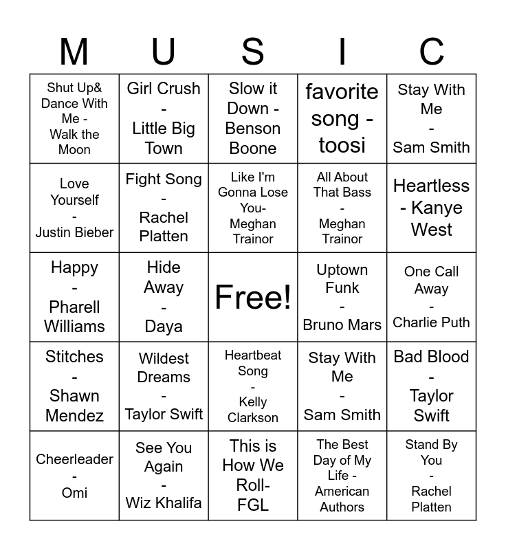This bingo card has a free space and 24 words: Wildest Dreams - Taylor Swift, See You Again - Wiz Khalifa, Like I'm Gonna Lose You- Meghan Trainor, Cheerleader - Omi, Stay With Me - Sam Smith, Shut Up& Dance With Me - Walk the Moon, Love Yourself - Justin Bieber, Girl Crush - Little Big Town, Uptown Funk - Bruno Mars, Heartbeat Song - Kelly Clarkson, All About That Bass - Meghan Trainor, Happy - Pharell Williams, Stay With Me - Sam Smith, Bad Blood - Taylor Swift, Fight Song - Rachel Platten, The Best Day of My Life - American Authors, One Call Away - Charlie Puth, Slow it Down - Benson Boone, Heartless - Kanye West, Hide Away - Daya, Stand By You - Rachel Platten, Stitches - Shawn Mendez, favorite song - toosi and This is How We Roll- FGL.