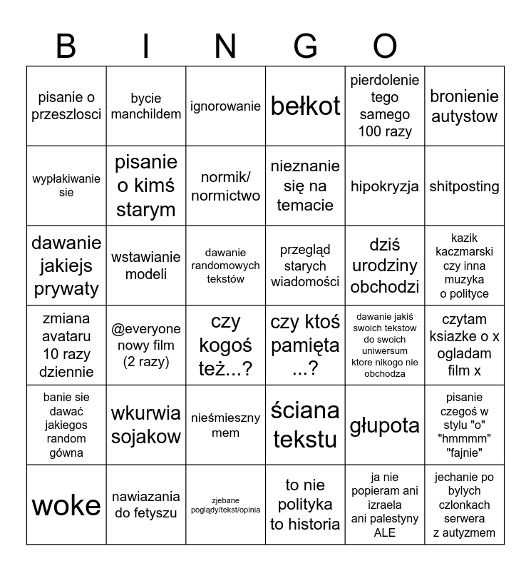 This bingo card has 36 words: ściana tekstu, nieśmieszny mem, to nie polityka to historia, wypłakiwanie sie, zmiana avataru 10 razy dziennie, przegląd starych wiadomości, pisanie o kimś starym, zjebane poglądy/tekst/opinia, pierdolenie tego samego 100 razy, głupota, shitposting, bełkot, pisanie czegoś w stylu "o" "hmmmm" "fajnie", wstawianie modeli, nieznanie się na temacie, pisanie o przeszlosci, banie sie dawać jakiegos random gówna, dziś urodziny obchodzi, dawanie jakiejs prywaty, ignorowanie, dawanie randomowych tekstów, @everyone nowy film (2 razy), czy ktoś pamięta ...?, czy kogoś też...?, dawanie jakiś swoich tekstow do swoich uniwersum ktore nikogo nie obchodza, bycie manchildem, hipokryzja, nawiazania do fetyszu, normik/ normictwo, bronienie autystow, jechanie po bylych czlonkach serwera z autyzmem, woke, czytam ksiazke o x ogladam film x, kazik kaczmarski czy inna muzyka o polityce, wkurwia sojakow and ja nie popieram ani izraela ani palestyny ALE.