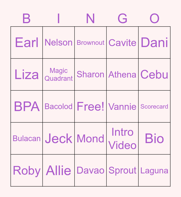 This bingo card has a free space and 24 words: Jeck, Allie, Sharon, Roby, Dani, Earl, Liza, Nelson, Vannie, Mond, Athena, BPA, Intro Video, Bio, Magic Quadrant, Sprout, Scorecard, Brownout, Cebu, Bacolod, Laguna, Bulacan, Cavite and Davao.
