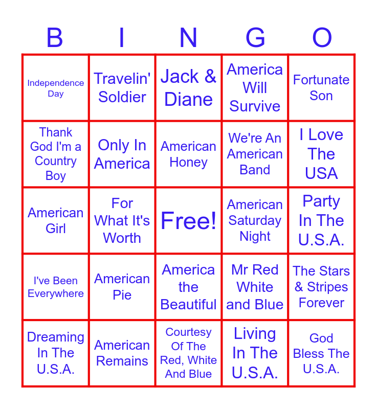 This bingo card has a free space and 46 words: Chicken Fried, God Bless The U.S.A., Born in the U.S.A., Courtesy Of The Red, White And Blue, American Pie, American Soldier, Travelin' Soldier, Sweet Home Alabama, Thank God I'm a Country Boy, Wagon Wheel, Only In America, America Will Survive, The Stars & Stripes Forever, Mr Red White and Blue, It's America, Where The Stars And Stripes And The Eagles Fly, American Honey, American Saturday Night, American Woman, Fortunate Son, For What It's Worth, Living In The U.S.A., Independence Day, We're An American Band, American Boy, I Love The USA, Dreaming In The U.S.A., The Land Is Your Land, America the Beautiful, I've Been Everywhere, Heartland, Surfin' U.S.A., Free Bird, Going Up The Country, I Am A Man Of Constant Sorrow, American Remains, Party In The U.S.A., R.O.C.K. In The U.S.A., The Devil Went Down to Georgia, Spirit In The Sky, East Bound and Down, Jack & Diane, American Girl, Back In The U.S.A., Pink Houses and The Star Spangled Banner.