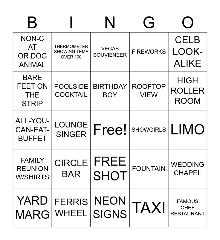 This bingo card has a free space and 25 words: CIRCLE BAR, NEON SIGNS, BIRTHDAY BOY, YARD MARG, CELB LOOK-ALIKE, NON-CAT OR DOG ANIMAL, BARE FEET ON THE STRIP, THERMOMETER SHOWING TEMP OVER 100, SHOWGIRLS, FREE SHOT, ROOFTOP VIEW, ALL-YOU-CAN-EAT-BUFFET, FOUNTAIN, WEDDING CHAPEL, POOLSIDE COCKTAIL, CASINO DEALER, LIMO, VEGAS SOUVIENEER, HIGH ROLLER ROOM, LOUNGE SINGER, FAMOUS CHEF RESTAURANT, FERRIS WHEEL, FAMILY REUNION W/SHIRTS, FIREWORKS and TAXI.