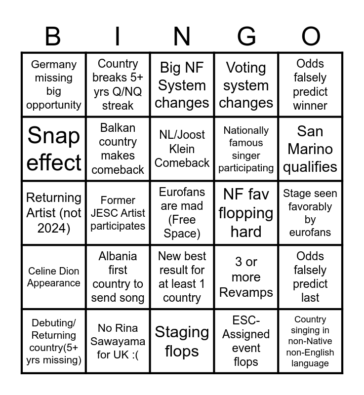 This bingo card has a free space and 24 words: Albania first country to send song, No Rina Sawayama for UK :(, NL/Joost Klein Comeback, Debuting/ Returning country(5+ yrs missing), Odds falsely predict winner, Germany missing big opportunity, Snap effect, Country breaks 5+ yrs Q/NQ streak, NF fav flopping hard, New best result for at least 1 country, Nationally famous singer participating, Returning Artist (not 2024), 3 or more Revamps, Odds falsely predict last, Balkan country makes comeback, ESC-Assigned event flops, Stage seen favorably by eurofans, Big NF System changes, San Marino qualifies, Former JESC Artist participates, Country singing in non-Native non-English language, Celine Dion Appearance, Voting system changes and Staging flops.