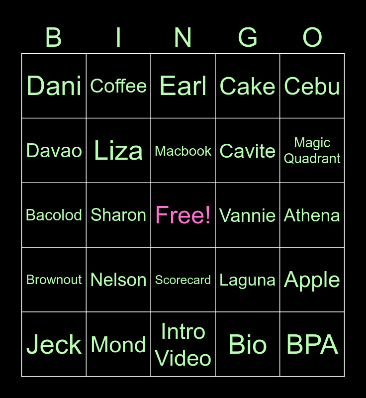 This bingo card has a free space and 29 words: Jeck, Allie, Sharon, Roby, Dani, Earl, Liza, Nelson, Vannie, Mond, Athena, BPA, Intro Video, Bio, Magic Quadrant, Sprout, Scorecard, Brownout, Cebu, Bacolod, Laguna, Bulacan, Cavite, Davao, Cake, Coffee, Apple, Macbook and EA.