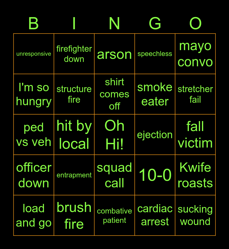 This bingo card has a free space and 29 words: load and go, stays this quiet, hit by local, crashes vehicle, unresponsive, arson, structure fire, entrapment, ejection, brush fire, fall victim, sucking wound, combative patient, cardiac arrest, stretcher fail, call while eating, squad call, officer down, mayo convo, ped vs veh, 10-0, justin accent, smoke eater, I'm so hungry, speechless, firefighter down, Kwife roasts, shirt comes off and wrong address.