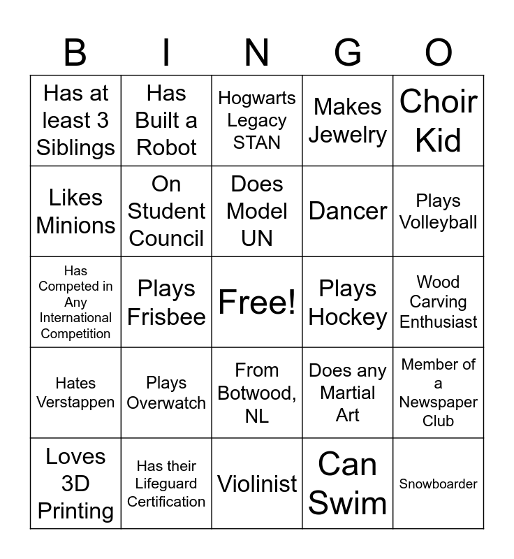 This bingo card has a free space and 24 words: Plays Overwatch, Has their Lifeguard Certification, Does Model UN, Loves 3D Printing, Choir Kid, Has at least 3 Siblings, Likes Minions, Has Built a Robot, Plays Hockey, From Botwood, NL, Dancer, Has Competed in Any International Competition, Does any Martial Art, Member of a Newspaper Club, On Student Council, Can Swim, Wood Carving Enthusiast, Hogwarts Legacy STAN, Plays Volleyball, Plays Frisbee, Snowboarder, Hates Verstappen, Makes Jewelry and Violinist.