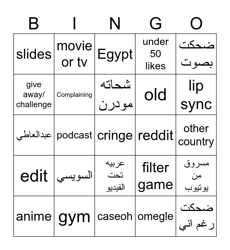 This bingo card has a free space and 24 words: السويسي, gym, شحاته مودرن, anime, ضحكت بصوت, slides, give away/ challenge, movie or tv, reddit, عربيه تحت الفيديو, old, عبدالعاطي, filter game, مسروق من يوتيوب, Complaining, omegle, other country, Egypt, lip sync, podcast, ضحكت رغم اني, edit, under 50 likes and caseoh.