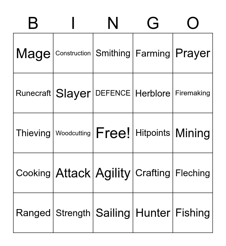 This bingo card has a free space and 24 words: Attack, Strength, DEFENCE, Ranged, Prayer, Mage, Runecraft, Construction, Hitpoints, Agility, Herblore, Thieving, Crafting, Fleching, Slayer, Hunter, Mining, Smithing, Firemaking, Woodcutting, Fishing, Cooking, Farming and Sailing.