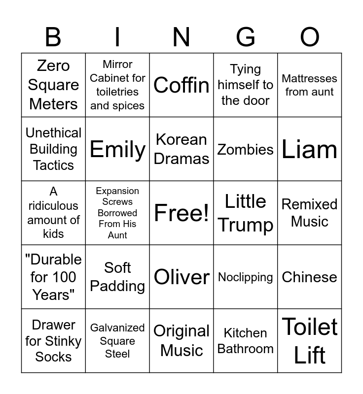 This bingo card has a free space and 30 words: Galvanized Square Steel, Eco Friendly Wood Veneer, Expansion Screws Borrowed From His Aunt, CHildhood Eagle, Zero Square Meters, Coffin, Emily, Oliver, Little Trump, Original Music, Remixed Music, Toilet Lift, Kitchen Bathroom, Induction Cooker, Liam, Moving Bricks, Noclipping, "Durable for 100 Years", Soft Padding, Mattresses from aunt, A ridiculous amount of kids, Tragic backstory, Mirror Cabinet for toiletries and spices, Zombies, Unethical Building Tactics, Tying himself to the door, Chinese, Drawer for Stinky Socks, Korean Dramas and Grammatical Error.
