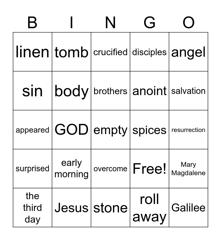 This bingo card has 25 words: early morning, stone, brothers, the third day, angel, linen, sin, tomb, spices, overcome, anoint, appeared, Free!, Mary Magdalene, body, Galilee, resurrection, crucified, salvation, GOD, empty, Jesus, surprised, disciples and roll away.