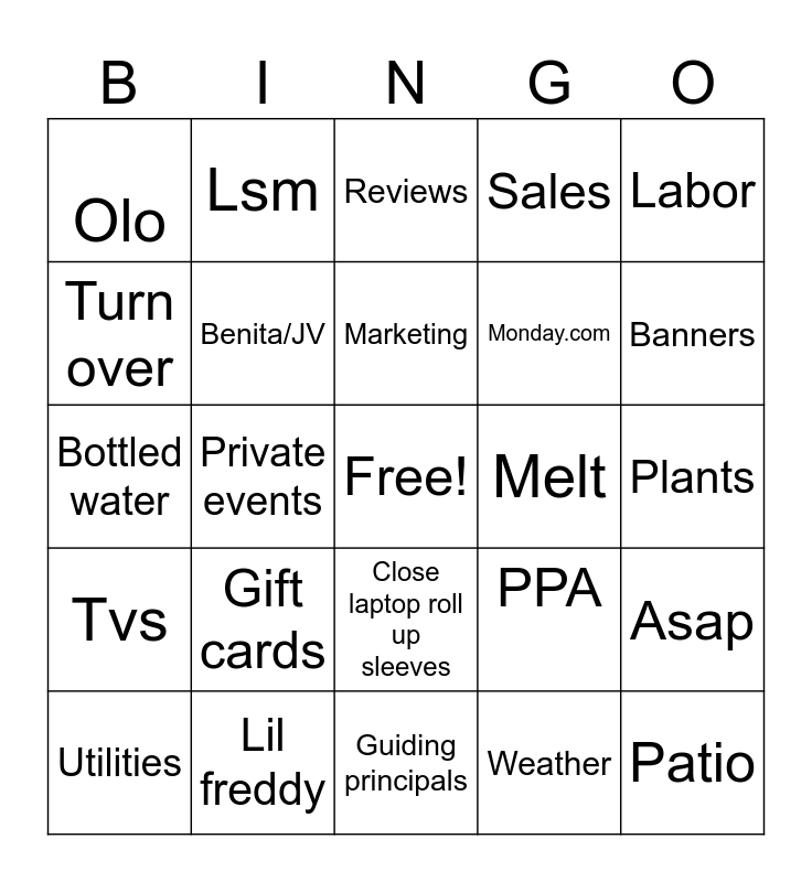This bingo card has a free space and 24 words: Gift cards, Lil freddy, Marketing, Utilities, Labor, Olo, Turn over, Lsm, Melt, Close laptop roll up sleeves, Monday.com, Bottled water, PPA, Asap, Benita/JV, Weather, Plants, Reviews, Banners, Private events, Patio, Tvs, Sales and Guiding principals.
